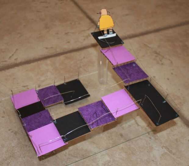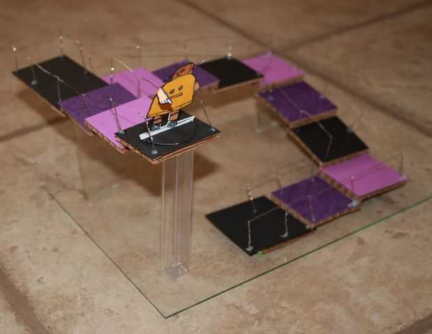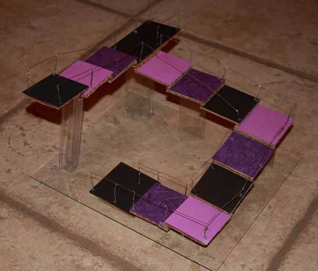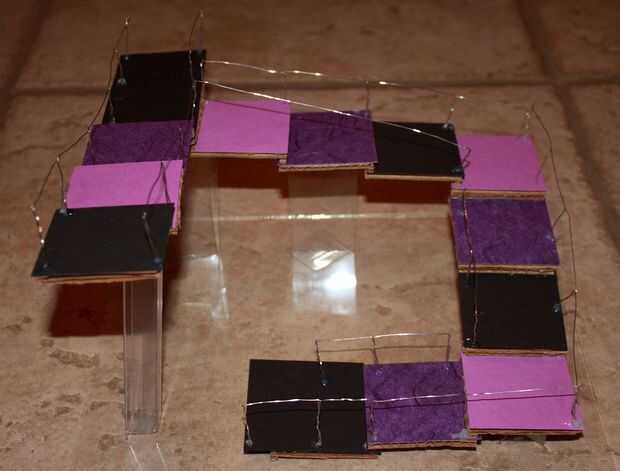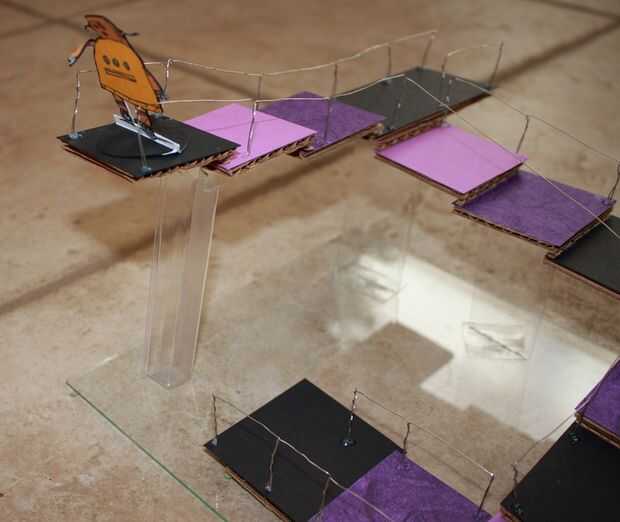 "La escalera de Penrose o pasos de Penrose, también llamados la escalera imposible, es un objeto imposible creado por Lionel Penrose y su hijo Roger Penrose. Una variación en el triángulo de Penrose, es una representación bidimensional de una escalera en la que las escaleras hacen cuatro vueltas de 90 grados que ascenderán o descenderán la vez forman un bucle continuo, para que una persona podría subir para siempre y nunca consigue más. Esto es claramente imposible en tres dimensiones".