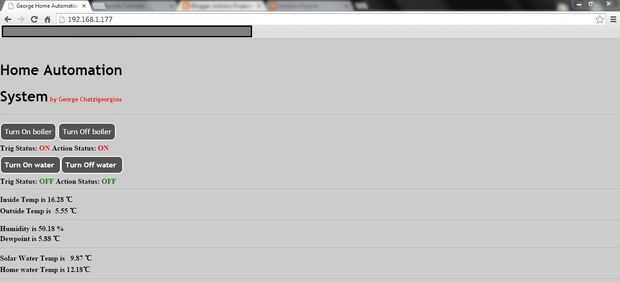 La página incluye un botones de disparo manual, estado de las salidas y las mediciones de los sensores en tiempo real.