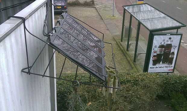 Este es el montaje de los paneles solares. Lo he arreglado les a un viejo estante de secado que cuelga en el balcón de mi departamento. Tres de los paneles se conectan al gabinete, uno está cargando una batería lenta. A pesar de que mi balcón se enfrenta a este, el rendimiento es suficiente para cargar la batería que se utiliza para cargar mi celular o jugar carradio incorporado.