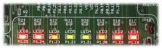 • La Junta de desarrollo incluye un código parpadeo de LED. Energía el tablero con cable Mini-USB incluido. Los LEDs actualmente a bordo debe empiezan a parpadear. Alternativamente, el tablero puede también ser accionado mediante un adaptador externo con una salida nominal DC 8-16V de abastecimiento por lo menos 500mA.