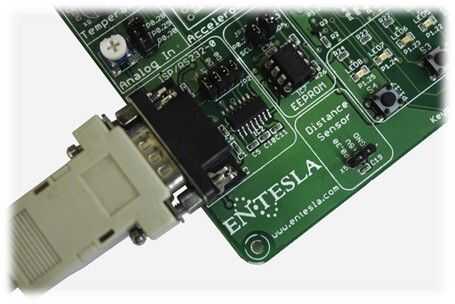 • Conecte un extremo del cable serie suministrado al puerto serie de su estación de trabajo (o convertidor de USB a serie si no hay un puerto serie) y el otro extremo al puerto RS232/ISP-0 de la Junta de desarrollo de ARM7.
