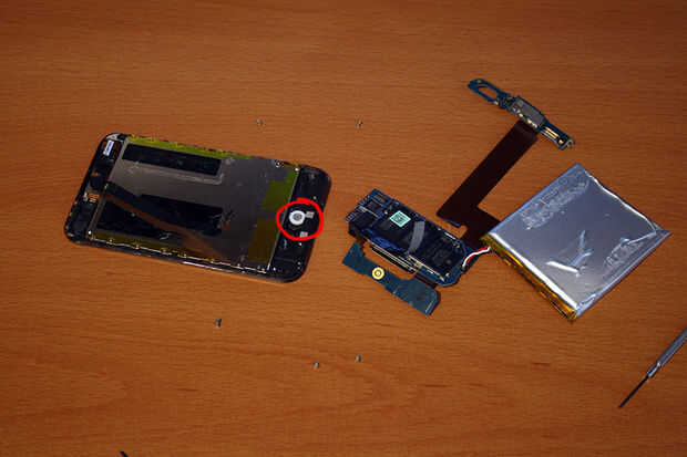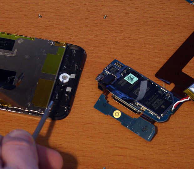 Con la Junta quitada ahora serás capaz de levantar todo el caso. Póngala a un lado y buscar en el iPod. Verá un pequeño disco blanco. Es el botón de inicio. A continuación el disco blanco es un anillo de oro. Cuando se presiona el botón de inicio el disco empuja hacia abajo y crea un circuito con el anillo. En mi caso el disco blanco había cambiado de puesto al lado. He encontrado mientras que buscando en Google que esto era absolutamente común. Hay un poco de pegamento que mantiene en su lugar y esto simplemente tenía que ir.