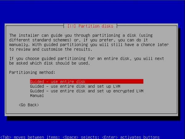 10. después de algunos más detección dirá "Particionando discos" seleccione guiado - utilizar todo el disco (que podría ir con lvm pero honestamente para uso doméstico no necesita y crea trabajo extra. golpe entrar.