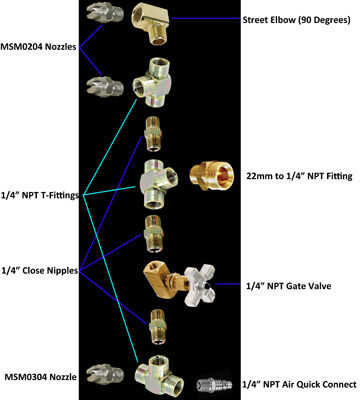 Instale la boquilla de MSM0304 frente a la manguera de aire en la instalación de T en la parte inferior. Otra vez Asegúrese de que la pulverización es paralelo a las boquillas superiores.