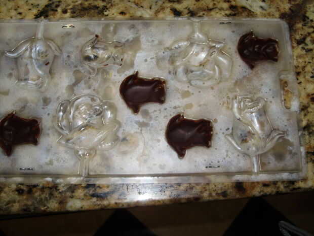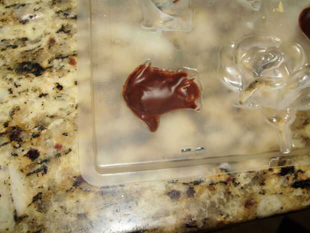 Las virutas de chocolate de microondas durante 15 segundos a la vez, para no quemarlos. Cuando está derretidos, vierta un poco de chocolate en el fondo de su molde. Difundirlo alrededor por lo que la parte inferior entera del molde está cubierta de una capa de algo de chocolate. Luego coloque su molde en el congelador para que el chocolate se endurece rápidamente.