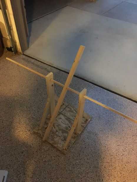 Ahora tome su brazo y averiguar de donde a donde desea que todo el que por lo que el árbol puede caber a través de. Decidimos poner todo tu 3/4 la forma a la madera. De esa manera tuvimos espacio para colocar el peso. Tome el taladro hacer un agujero y conectar el eje. Debe verse así cuando haya terminado.