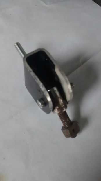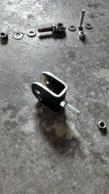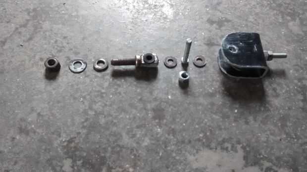 tomar placa de 3cm de ancho y 6cm aluminio largo. montaje de freno hígado de bicicleta Dos tuerca y perno hacer la forma de u de la placa y hacer tres agujeros. uno en la parte superior y dos en el lado de ambos. Juntar todos. ver la imagen.