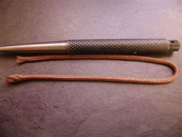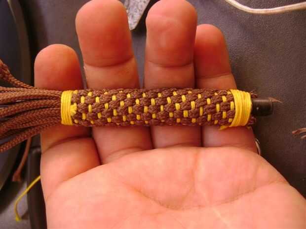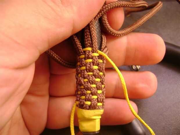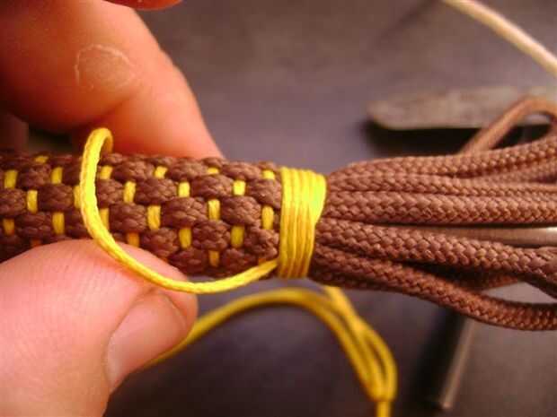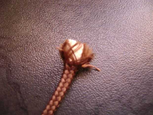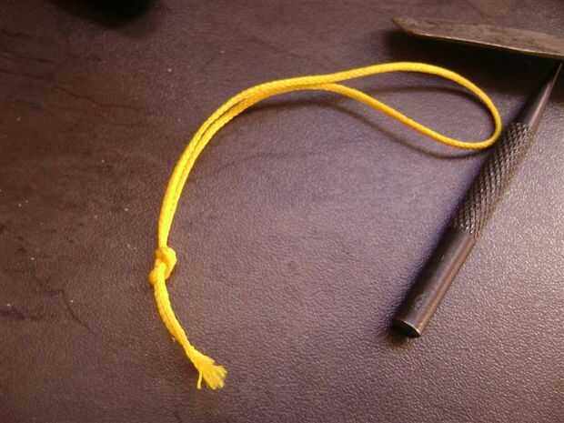 Tomar el lazo que hicimos al principio, colóquelo contra donde la línea de urdimbre salió último y hacer seis bucles apretados alrededor del objeto antes de la línea de corte y enhebrado en el lazo anudado.