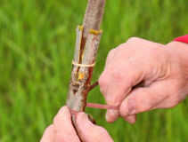 Ahora es el momento de utilizar la banda elástica para sujetar las aletas en posición. Asegúrese de que el tejido del cambium del scion se asiente contra el tejido del cambium del portainjerto.