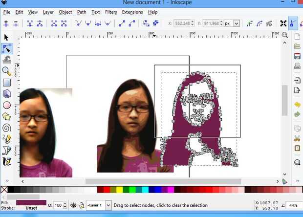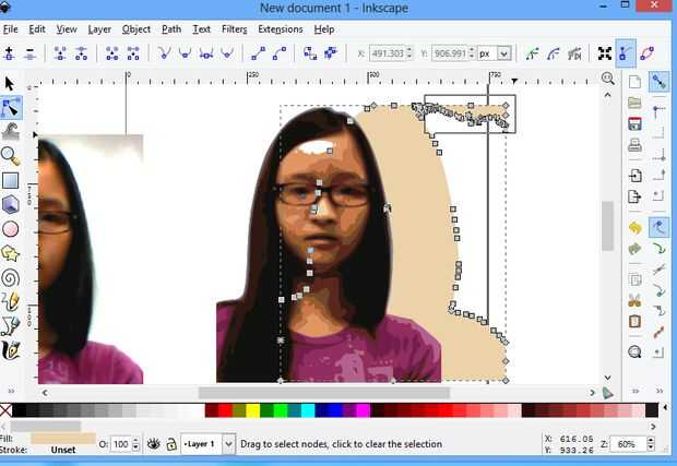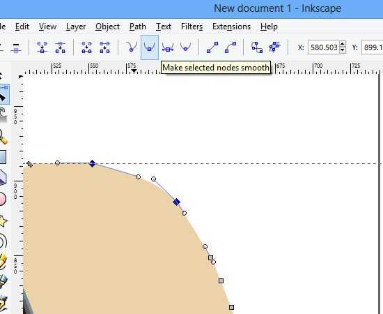 Por ejemplo, cortar una porción grande. En la capa de color melocotón, queremos eliminar el exceso por encima de su cabeza. Después de sacar la capa deseada con el selector de normal (normalmente con imágenes de trazado es un poco complicado), utilizar el editor de camino y arrastre un rectángulo sobre la parte que desea eliminar. Eliminar y a suavizar el cambio. Usando el editor de trazado, arrastre el borde del objeto sí mismo o nodos/nodo "armas" para ajustar la forma. También puede hacer clic en nodos individuales para borrarlas. Cambio le permite seleccionar varios nodos a la vez.