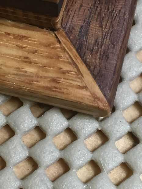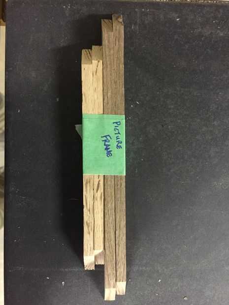 Cortar las piezas para ir alrededor de la base para un agradable aspecto acabado. Después de un par de intentos y un conjunto de piezas de marco de foto más adelante, tenía un fondo acabado. Por supuesto también tuve un hipo. Un inglete fue un poco (1/8") corto. En lugar de recortar otro pedazo, (principalmente porque estaba hacia fuera) puse un trozo en la brecha y pegué en. Cuando se seca me cortar y lijar a apenas perceptible. Mi grueso final era 1/8".