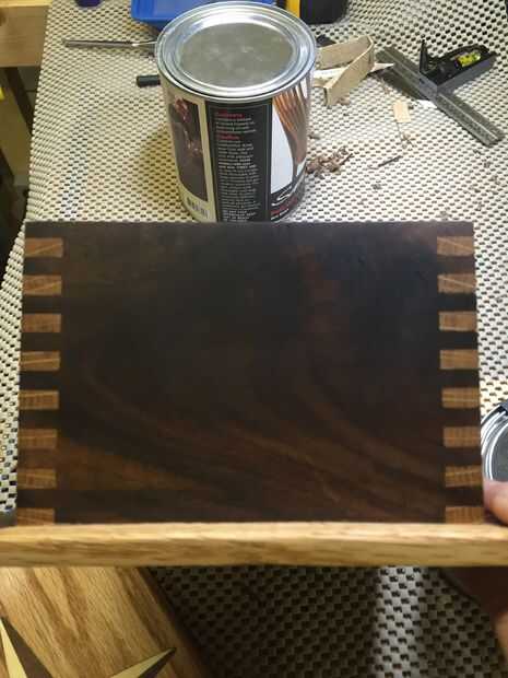 So... ver que acabado lleva tanto tiempo para secar, (24 horas entre capa y capa en mi caso) pensé que pondría el acabado en. Mientras se está secando que puedo mover a la construcción de la bandeja. Elegí terminar Sam Maloof. Poly el aceite y cera de polietileno. Esto es lo que parece hasta ahora con solo 2 capas.