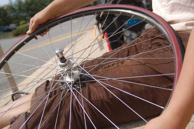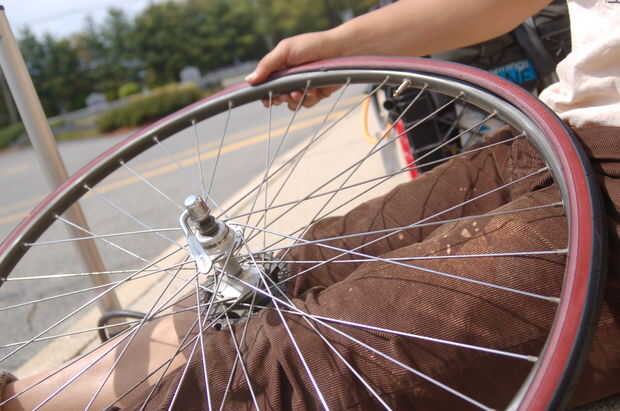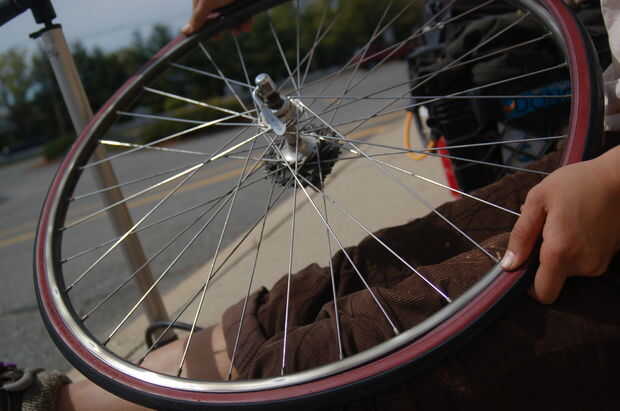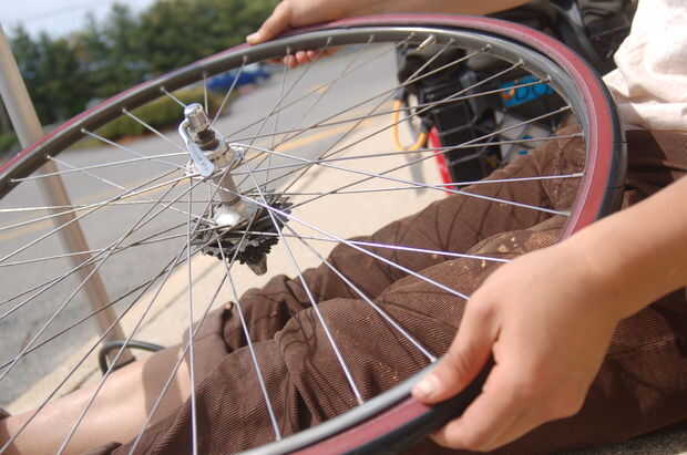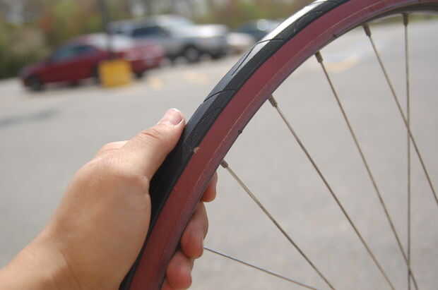 Utilice los pulgares para presionar el borde del neumático para arriba sobre el borde.