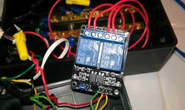 Ahora echemos un vistazo a la SSR. El SSR espera cuatro conexiones a la placa Arduino, un + 5v conexión, una conexión de tierra y dos conexiones de señal digital que controlan los dos relés. Me pareció más simple para la soldadura de las conexiones en la parte inferior de la placa de circuito como. El SSR tiene tres terminales de tornillo por relé. Tomar dos tiras de seis pulgadas de alambre de par trenzado y atorníllelos en el terminal del centro. Luego tomar dos tiras de seis pulgadas adicionales de cable de par trenzado y atorníllelos en el terminal izquierdo de cada relé como se muestra. A continuación ate todo el tablero a los separadores para que los relés se apoyará contra la placa frontal de la caja del proyecto.