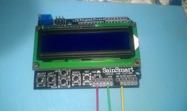 Ahora soldar los dos hilos de control digital de la SSR a los puertos digitales de 2 y 3 de la pantalla del LCD/teclado SainSmart. La soldadura de tres cables de seis pulgadas para los 5v, Gnd y puerto analógico 1 del escudo SainSmart LCD/teclado, respectivamente.