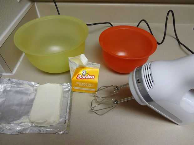 Dos tazones de fuente de mezcla y vierta 1/4 taza crema para batir en el bol más pequeño. Un recipiente pequeño es mejor para batir pequeñas cantidades de nata