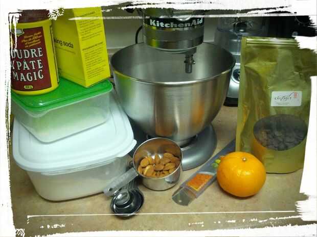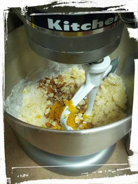 Mezclar harina, azúcar, sal, bicarbonato y polvo de hornear. Añadir el aceite, el huevo y la clara de huevo y mezclar en batidora o a mano. Añadir la ralladura, aceite y almendras picados.