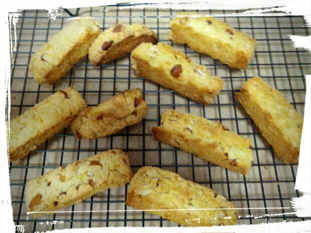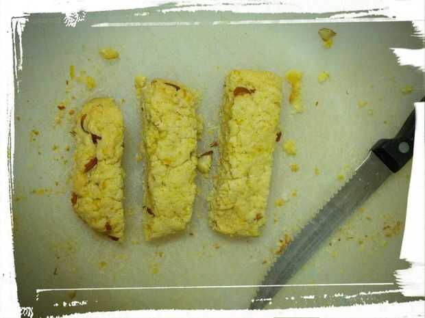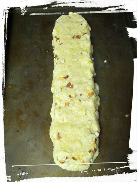 Forma la masa en forma de registro en una bandeja de hornear engrasada. Cocer en horno de 350 grados durante 20 minutos. Sacar y dejar enfriar. Cuando esté fría, bien, rebanadas de pan de rodaja. Hornear durante 10 minutos en horno de 350 grados, mentira las cookies en un lado. Habilitar las cookies para el otro tamaño y hornear durante otros 10 minutos. Deje que se enfríe.