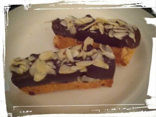 Sumergir las galletas refrigeradas longitudinalmente en almendras de chocolate y rodajas de couverature templado. Que chocolate endurezca. Devorar con expresso y vivir la dolce vita!