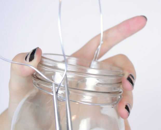 Enganche el cable del mango bajo el alambre que sólo estaba envuelto alrededor de la jarra. Una vez más, crear lazos y apriete con los alicates. Corte cualquier exceso de alambre.