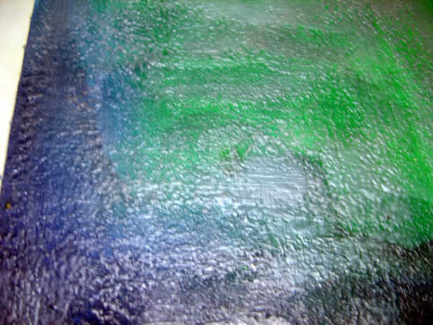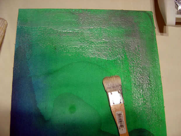 Una vez que la encáustica se derrita totalmente, utilice un cepillo (1 pulgada ancho o que es bueno) para recoger algunos cera y cepillo a través del tablero. Mantener la Junta cerca de la pintura como sea posible debido al goteo potencial. Seguir haciendo esto hasta que tenga una capa bastante buena sobre todo de él. No será constante, pero eso está bien.