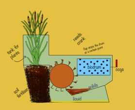 un compacto inodoro de compostaje con un jardín a su espalda el aseo recoge humanos compostas abonos a través de la maquinaria interna y usar el compost para crecer las plantas en la parte posterior del inodoro el inodoro es lo suficientemente compacto para ser colocado en un cuarto de baño en un apartamento normal el inodoro es respetuoso del medio ambiente. No necesidad de agua o electricidad suministros para ejecutar.