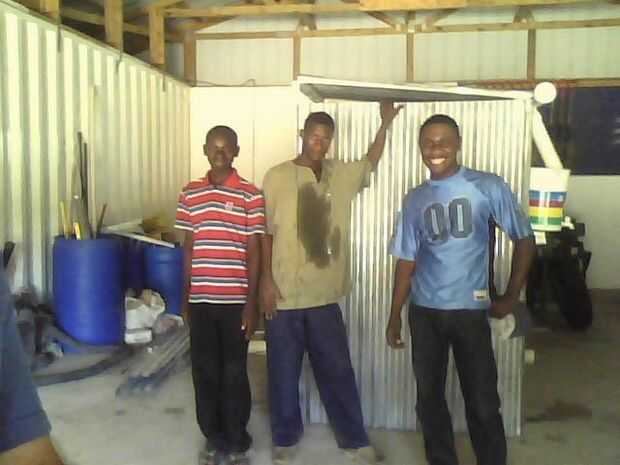 El cerramiento se construye de los paneles de lata corrugada sobre marcos de tubo de PVC. El estaño se une con lazos de alambre de enfardar y los paneles se unen con alambre de enfardar. El techo del recinto está inclinado hacia un borde de goteo en la parte trasera donde el agua de lluvia se dirige a un cubo cubierto con grifo para lavarse las manos. La entrada es una cortina hecha de un pedazo de lona. Esto resulta en una caja de luz pero fuerte levantada fácilmente por una sola persona. El recinto está anclado a una losa de hormigón portátil con 4 tornillos y los soportes.