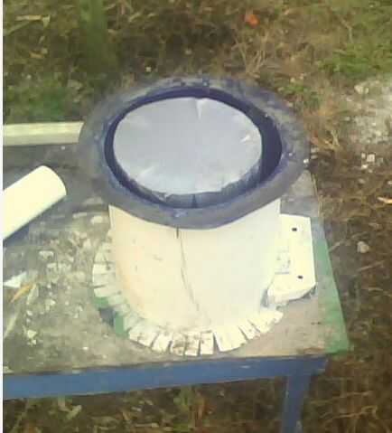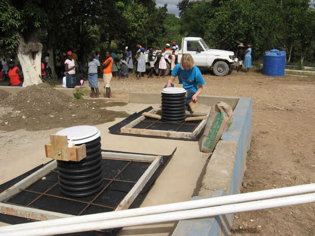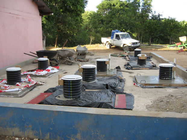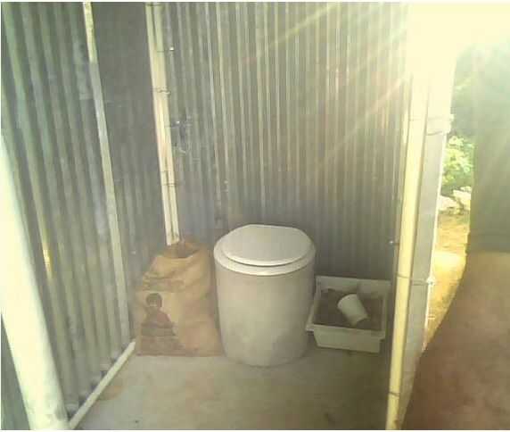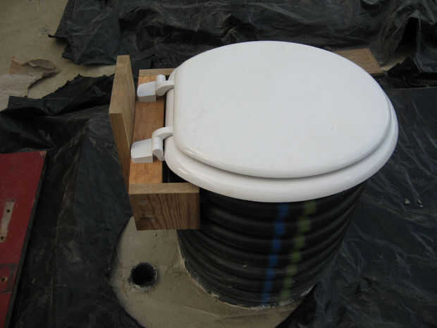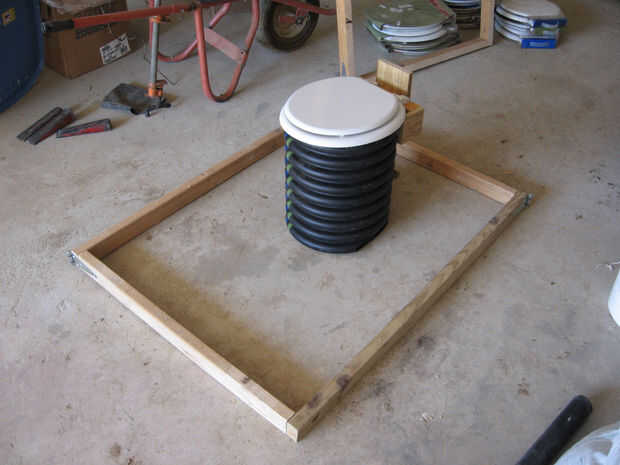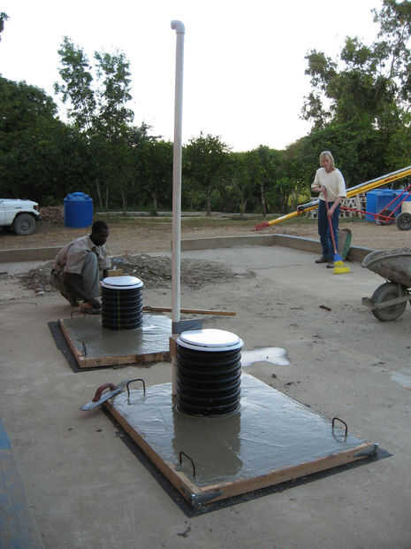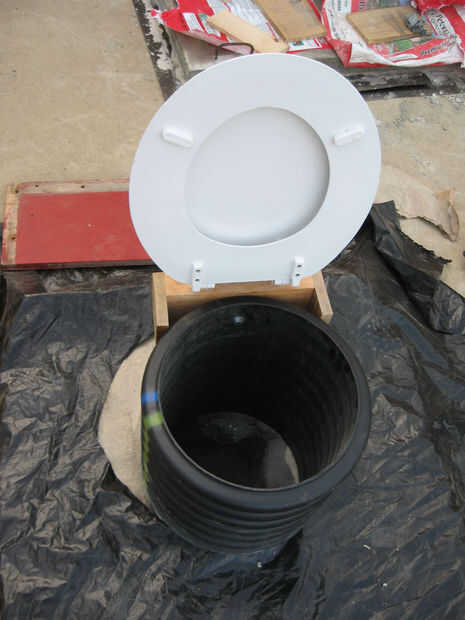 Un grupo de agricultores de Ohio llegaron a la misión donde estaba trabajando en este proyecto con tubo de drenaje de plástico negro para su uso como los pedestales de los inodoros de compostaje - una solución más rápida y más ligera para asegurarse. También se fueron con un pequeño tubo de ventilación de 2". He incluido las siguientes imágenes cortesía de Roger Borchers como un método alternativo de construcción. Chicos gran trabajo!