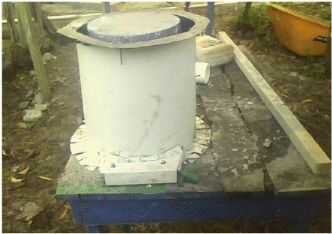 La cáscara exterior es de unos 15" de diámetro (las paredes del pedestal vertida será de 1-1/2" de espesor.) y 14" de alto. Está formado de una hoja que ha sido atornillada entre sí donde se superponen los extremos. Los pernos de la superposición de cara al exterior de lo que forma la pared del pedestal. Se corta una muesca donde se encuentra para el vertido concreto pasar a través en la extensión cubierta la extensión. Dedo se extienden hacia fuera desde la parte inferior de la carcasa exterior y se atornillan a la base. La parte superior de la carcasa exterior también tiene fichas de dedo que se atornillan a un anillo redondo para sostener la otra shell rígido en la parte superior durante el vertido.