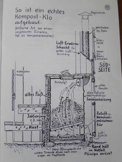 A través de la abertura en la parte inferior puede sacar composta. Si hay demasiado líquido, un pequeño tubo de drenaje en la parte inferior del cañón tiene sentido, que conduce a un cubo debajo del inodoro. Este líquido marrón casi inodoro es muy potente fertilizante, que puede ser utilizado diluido 1:10, en árboles frutales y arbustos o alta verduras como el tomate o la berenjena.