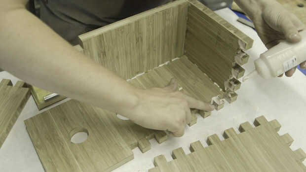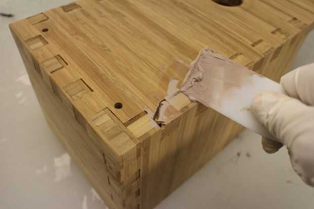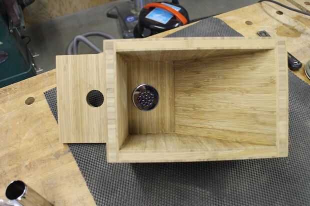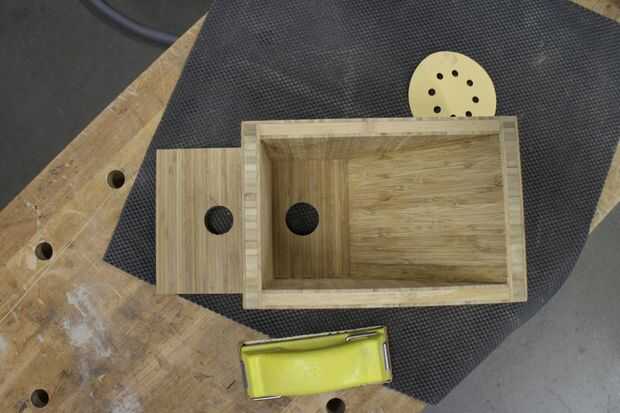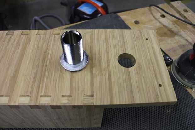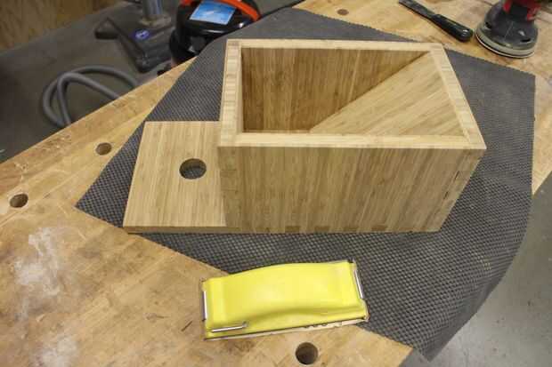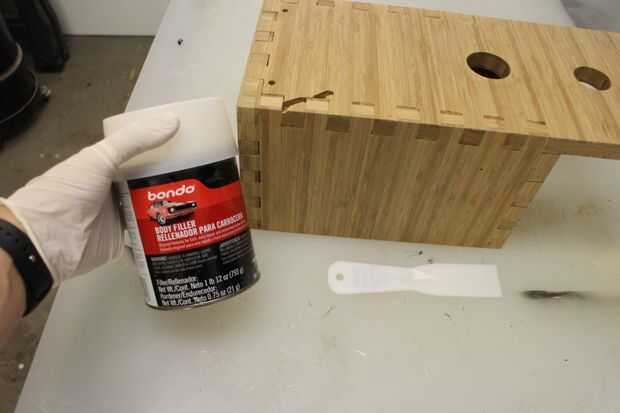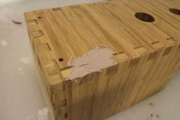 • No había apretado bastante mi broca y la broca se desvió hacia abajo en uno de mis pasos, dejando un surco desagradable en el plyboo. Afortunadamente pude ocultar este error en la parte inferior de la caja. Utilizado Bondo para llenar el vacío.