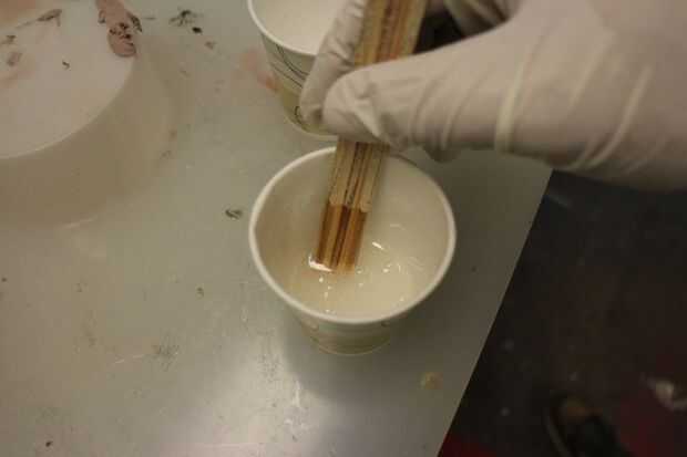 Después de 2 minutos de agitación, me vertió la capa liberalmente en una probeta y extienda con una espátula. Después de unas 6 horas, la obra fue totalmente curada y totalmente impermeable (por lo menos donde el plástico estaba).