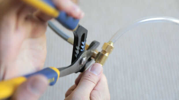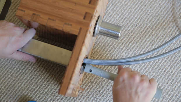 - Algunos E-6000 se aplican a la Junta de goma en la tensión de drenador, luego en el orificio de desagüe y apriete la tuerca con unos alicates de bloqueo de canal.