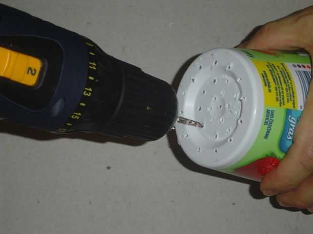 Taladre un orificio de 5/16 de pulgada en la tapa del envase.