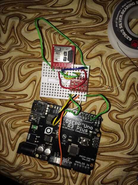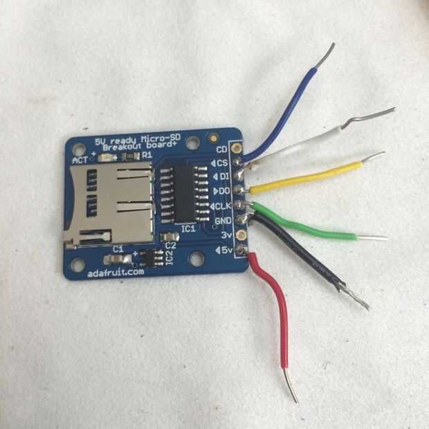 Colocó sobre el uso de tablero de arranque de Adafruit microSD, que puede manejar una tensión de alimentación de 5V, así como comunicarse con lógica de 5V. También compré un genérico 8 GB tarjeta micro SD en Ebay.
