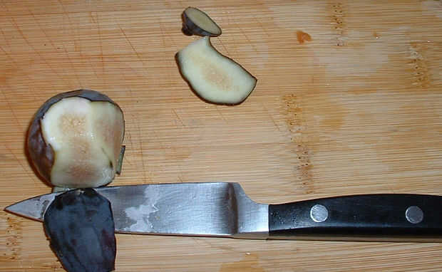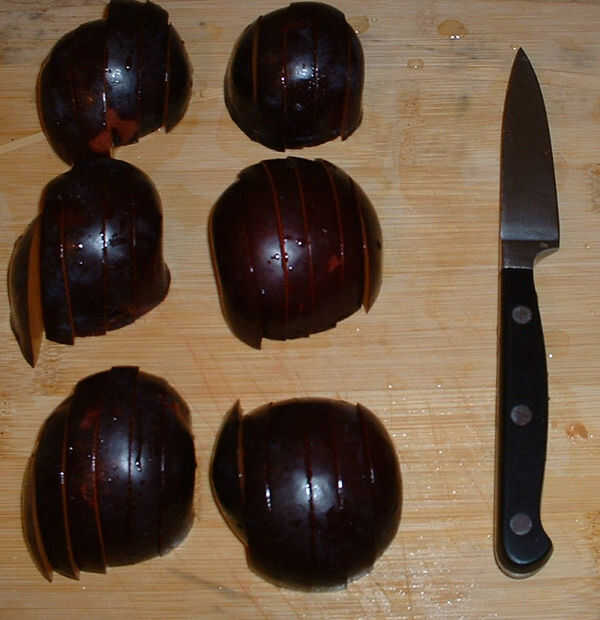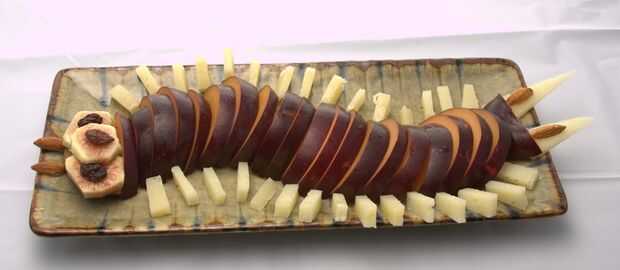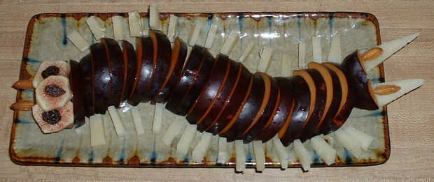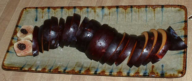 La parte más reconocible y prominente de un milpiés es el exoesqueleto redondo brillante por lo que fue la parte más importante para hacer bien, y resulta que las ciruelas negras son sorprendentemente bien con visual. Para crear el cuerpo primer corte las ciruelas por la mitad y quitar los hoyos. Cortar cada ciruela en. 25" rodajas, deseche los pedazos de extremo torpes y colóquelos en un plato de presentación en una forma sinuosa. Colocar pieza de ciruela en su lado en un extremo del cuerpo para crear una plataforma para la cabeza.