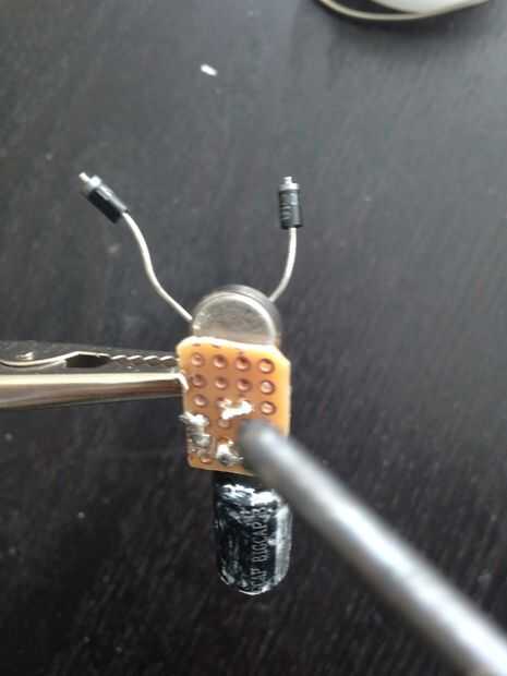 La soldadura de dos diodos justo debajo del motor de la vibración que actuará como las falsas antenas del insecto bot.