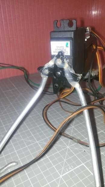 Coloque las patas de aluminio para la sujeción del Servo primero con un cable puente y que caliente pegar. No necesita adjuntar el attchment ahora. Les puede conectar luego.