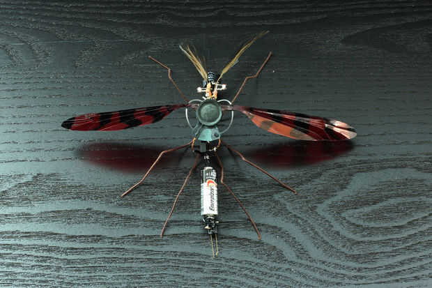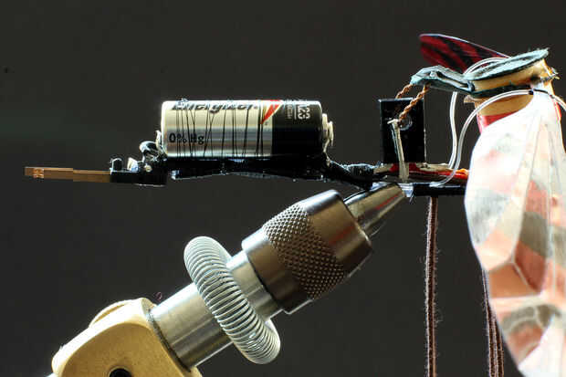 Atar una batería pequeña de 12V en el abdomen y la batería seguro conduce a tener una conexión sólida. Tuve que añadir unos trozos de monofilamento pesado al abdomen para impedir que los bancos el lado opuesto del abdomen como até en la batería.