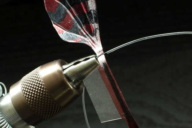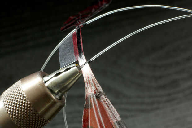 Corte dos piezas, cinco pulgadas de largo y colocar una pieza en la mordaza. Sin apretar atar las alas al monofilamento en un patrón de ocho.