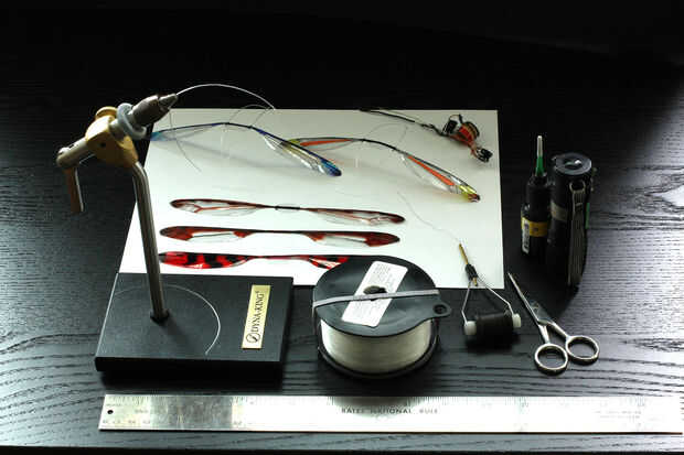 Para comenzar a atar, necesitarás alrededor de 35 libras monofilamento, nuestro tornillo desde antes, tijeras, alas, hilo y una mosca atar la bobina. * Corrección sugerido: Utilizar más pesado monofilamento o alambre fino para estos soportes de ala. El modelo en la foto y construido pierde eficacia mecánica cuando el monofilamento postra hacia afuera durante el movimiento.