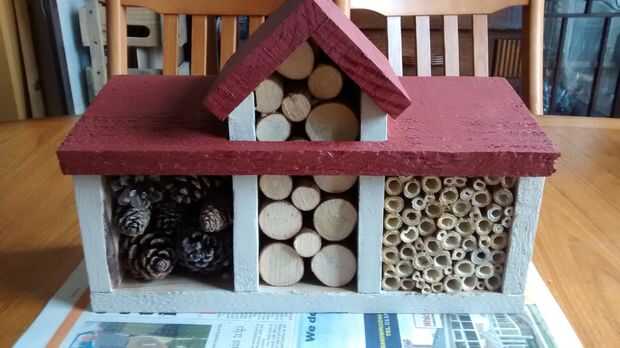 Mi vecino tiene este y desde entonces ha llenado de bambú y extraños trozos de madera perforado. Mis tres son un poco más mixto (y diferentes formas... Obtener aburridos muchos haciendo lo mismo!). Llené los palillos de madera con varios agujeros con un taladro de mano una vez que había pegado en su lugar. También pinté mío, pero solo la parte exterior (sólo para mantenerlo agua apretado!). Los interiores son totalmente naturales. No quiero posponer los bichos!