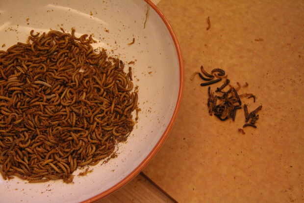 Gusanos de la harina generalmente vienen en una bolsa con periódico en el que puedan arrastrarse alrededor en.