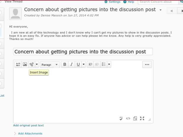 1. cuando quiere insertar una imagen en D2L mensajes de discusión, el primer paso es hacer clic en el botón a la izquierda del que utiliza para insertar un enlace. Se ve como una imagen cuadrada de dos colinas y un sol (al menos eso es lo que veo).