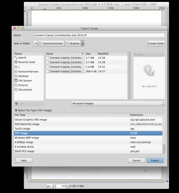Dentro de GIMP, editar la página que desea insertar algo en. Si usted no puede trabajar con GIMP, editar el formato TIFF correspondiente en su programa de edición de imágenes favorito. De cualquier manera, usted debe terminar con un TIFF independiente para cada página en su PDF. Exportar a TIFF en GIMP es fácil si sabes cómo. Archivo-exportar como... y Seleccione tipo de archivo (TIFF imagen). Compruebe si su TIFF está todas hermosas. Deberían tener cada vez más nombres, como page01.tif, page02.tif, etc..