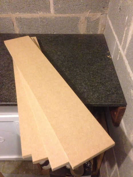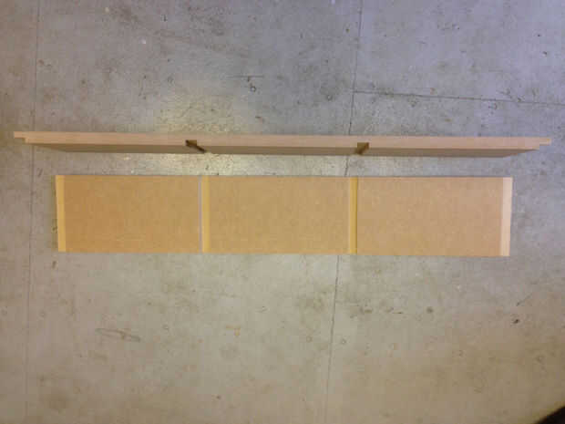 Sin embargo, la hoja MDF fue reducida a formas de longitud 140mm tiras. Entonces cada una de las piezas fueron cortados a la medida según la lista de corte con un brazo radial vio.