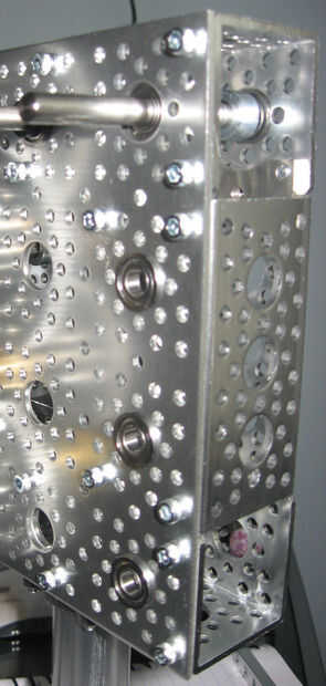 - Insertar rodamientos en los cuatro agujeros de 1/2 en lado izquierdo del panel, en los cuatro agujeros de 1/2" en el lado derecho del panel y en los orificios en la mitad superior y parte inferior media 1/2" del panel. Un reborde del rodamiento debe quedar al ras con la placa. Que tenga que jugar con la colocación de las piezas de la canal para permitir que los rodamientos montar al ras. Una vez que todos los diez rodamientos queden al ras, con mucho cuidado apriete todos los tornillos que sujetan las piezas de la canal en el panel; Asegúrese de que los cojinetes queden al ras como aprieta. Nota: puede ser más fácil de realizar este paso con el marco de la colocación plana en lugar de montados en el soporte.