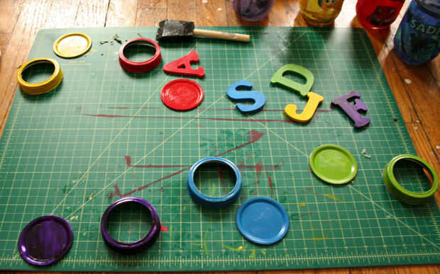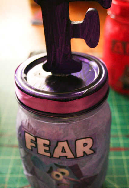 Por último, agregar alguna personalización para tus frascos caliente pegado las letras de los nombres encima de la tapadera del personaje. Recuerde: A es de enojo, S es de tristeza, D es para disgustar, J es de alegría y F es por miedo. Además, asegúrese de que utilice los mismos colores exactamente como lo hizo con las tapas del tarro para sus cartas hacerlos estallar hacia fuera!