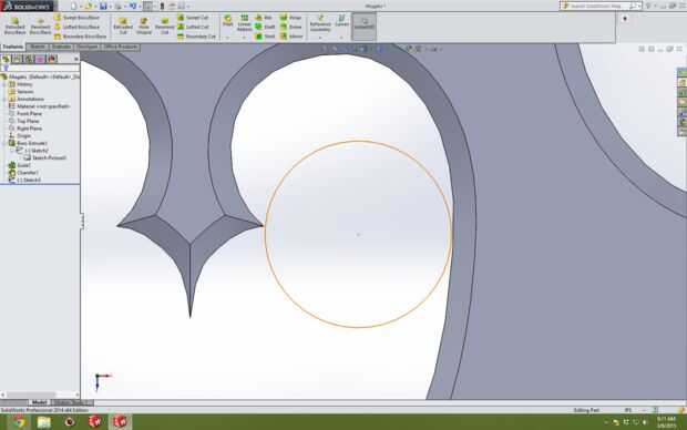 Me gusta dibujar un círculo de referencia de tamaño de herramienta para verificar que la herramienta de corte más grande que pueda usar. Esto hace que para un programa que se ejecuta más rápido y un cortador más tieso que puede dejar un mejor acabado. En este caso una fresa de 1/4" sólo pasa por la parte más angosta del modelo.