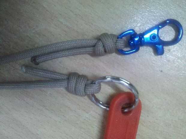 El final de 'nudo' se une con el anillo de presión también conocido como llavero (ello es opcional y podría estar metido correctamente en las envolturas)